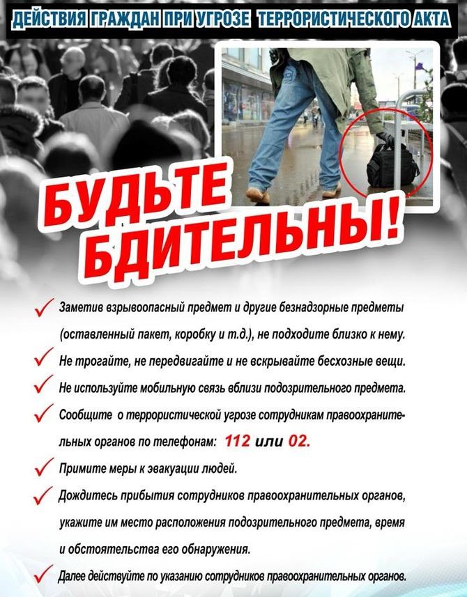 Будьте внимательны к деталям: Обращайте внимание на незнакомых людей, подозрительно ведущих себя, оставляющих бесхозные предметы.
